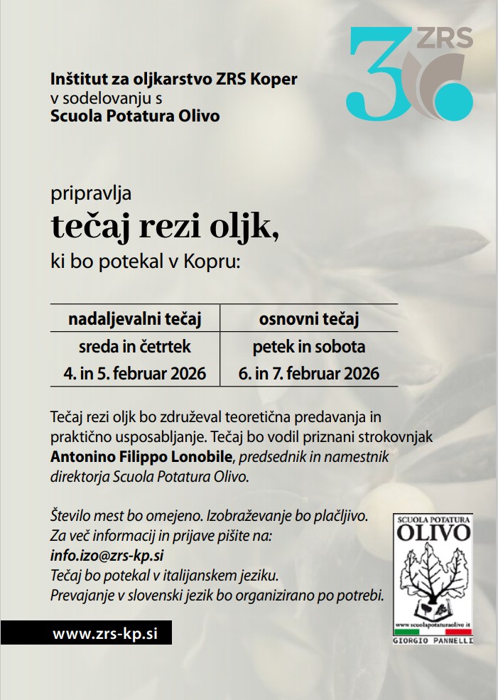 Inštitut za oljkarstvo ZRS Koper v sodelovanju s Scuola Potatura Olivo pripravlja tečaj rezi oljk, ki bo potekal v Kopru v začetku februarja 2026.